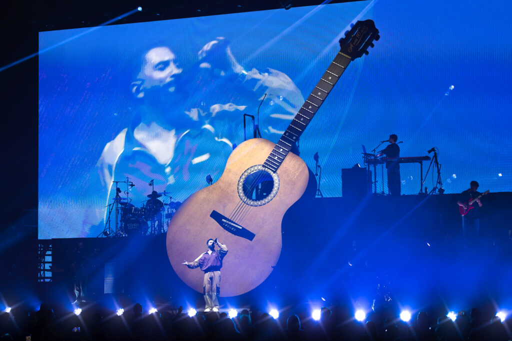 Une fois le morceau terminé, il se relève sous les applaudissements et traverse à nouveau la foule, cette fois en direction de la scène. C’est là que le décor se dévoile complètement : en fond, une immense guitare domine l’espace, éclairée par des jeux de lumières chauds qui habillent tout le plateau.